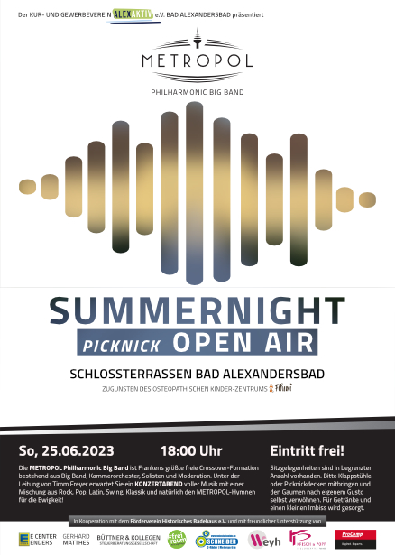 Es ist Zeit für Klappstuhl, Picknickdecke, leckere Knabbereien, einen lauen Sommerabend und viel Musik. Der Kur- und Gewerbeverein ALEX AKTIV e.V. Bad Alexandersbad präsentiert zum ersten Mal ein besonderes Konzertereignis.