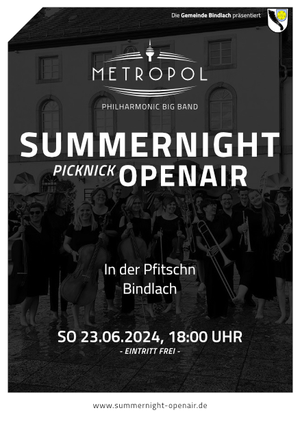 Im Rahmen der diesjährigen Summernight Open Air - Tour gastiert die METROPOL nun erstmals in Bindlach. Bei dem Benefizkonzert erwartet Sie ein musikalischer Abend, an dem für jede und jeden etwas dabei sein wird. Auf den Notenpulten liegen beliebte Klassiker wie „New York, New York“, „Lemon Tree“, „Palladio“ und „I’m So Excited“, sowie „The Way We Were“, ein Solo-Stück für Posaune, „Don’t Stop Me Now“ und „Fantasy“ in wunderbaren Chorversionen bereit. Auch zahlreiche neue Arrangements von ABBA, Nino Roti, Guns’n’Roses, Spandau Ballett und vielen mehr runden die kurzweilige Sommernacht ab.